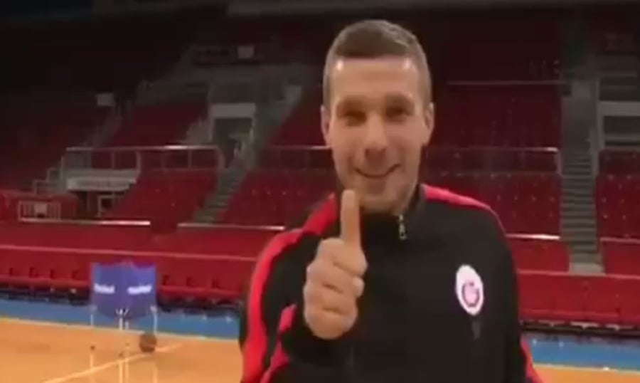 שחקן הכדורגל הגרמני לוקאס פודולסקי נכנס אל אולם הכדורסל של קבוצת גלאטסראיי הטורקית הקפיץ כדור על הרגל וצלף מחצי מגרש. לקינוח הוא אתגר את גדול שחקני הכדורסל הגרמני. צפו (ספורט)