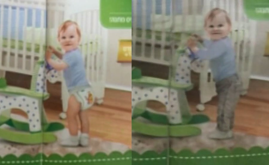 בעוד הפרסומת המקורית כללה תמונה של תינוק הלובש טיטול וחולצה קצרה, הטילו בהמודיע צנזורה על התמונה המקורית ו"הלבישו" לתינוק מכנסיים וחולצה ארוכה.