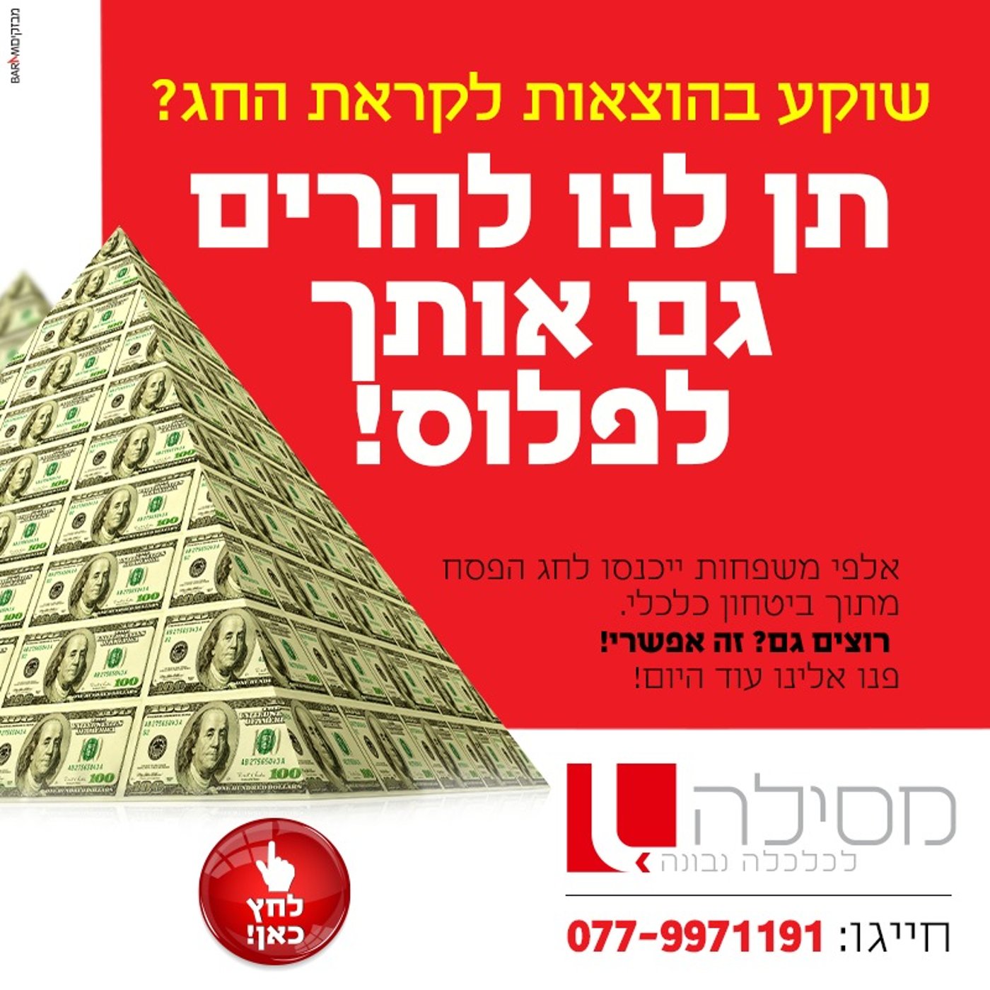 כעת לפני חג הפסח שכולנו מוצאים את עצמינו מרוקנים כיסים ועו"ש מידי יום, מאות ואלפי שקלים על הוצאות החג המרובות והמגוונות, מסילה יוצאת בהצעה מיוחדת על רכישת הערכה בבחינת מתנה טובה מבית גנזי מסילה, תקבלו ממנה כלים אדירים ונבונים להתנהל נכון ולהמשיך בשגרת חייכם מתוך שלווה ורוגע, שמחה והרווחה ולהיכנס באמת לליל התקדש חג כבני חורין!