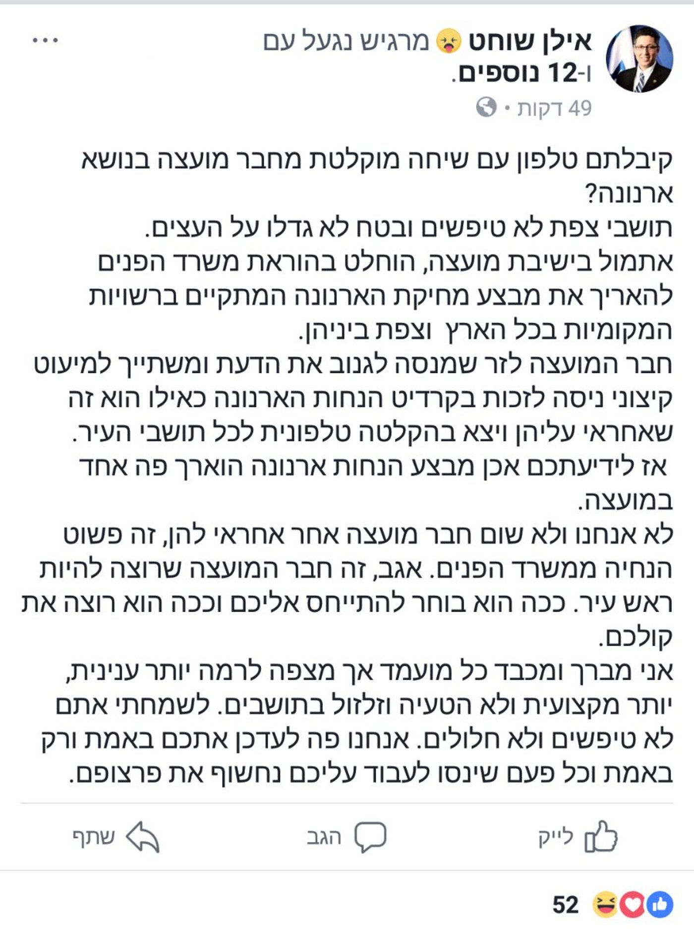"אז לידיעתכם אכן מבצע הנחות ארנונה הוארך פה אחד במועצה. לא אנחנו ולא שום חבר מועצה אחר אחראי להן, זה פשוט הנחיה ממשרד הפנים. אגב, זה חבר המועצה שרוצה להיות ראש עיר. ככה הוא בוחר להתייחס אליכם וככה הוא רוצה את קולכם", כותב שוחט.
