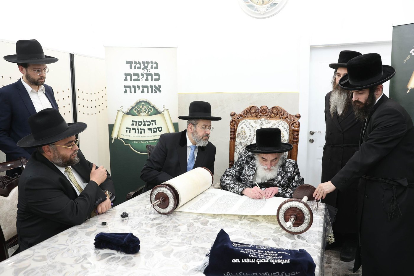 יממה לפני הכנסת ספר התורה הגיע הגר"ד לאו למעונו של ראש הישיבה הגרי"ג אדלשטיין, אשר שוחח עם הרב הראשי באריכות בענייני השעה וכתב אות בספר התורה. לאחר מכן הגיע הרב הראשי למעונם של כ"ק האדמו"ר מויז'ניץ וראש ישיבת 'בית מתתיהו' הגאון רבי ברוך ויסבקר אשר כתבו אות בספר התורה.