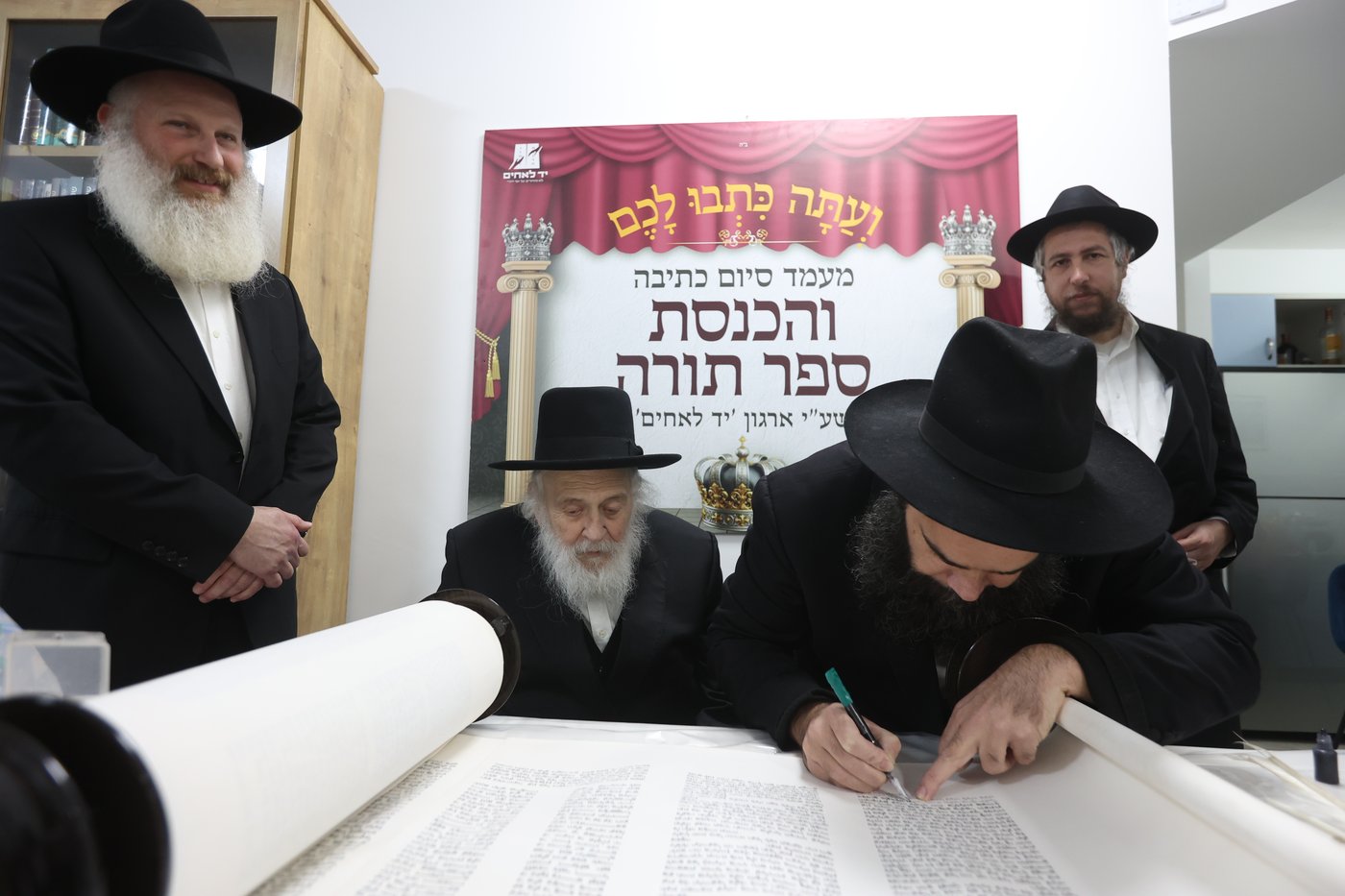 בצהרי היום נערכה כתיבת האותיות בבית המשפחה, כשבה השתתפו בין היתר מזכיר בית דין רבני חב"ד ורב קהילת חב"ד בקרית מלאכי הרב יצחק יהודא ירוסלבסקי שליט"א, בנו ויד ימינו ברבנות הרב בן ציון ירוסלבסקי, המשפיע הרב אברהם פרידלנדר, ידיד המשפחה הרב יעקב צירקוס שזכה בעצמו בעבר בספר תורה בהגרלת יד לאחים, רבני ומשפיעי השכונה וכן קרובים וידידים נוספים. עוד נטלו חלק בכתיבת האותיות פעילי יד לאחים שעמלו אישית סביב הכנסת ספר התורה ובראשם הרב חיים אייזנברג, הרב משה ביטון, הרב חיים קאהן, הרב יואב זאב רובינסון.