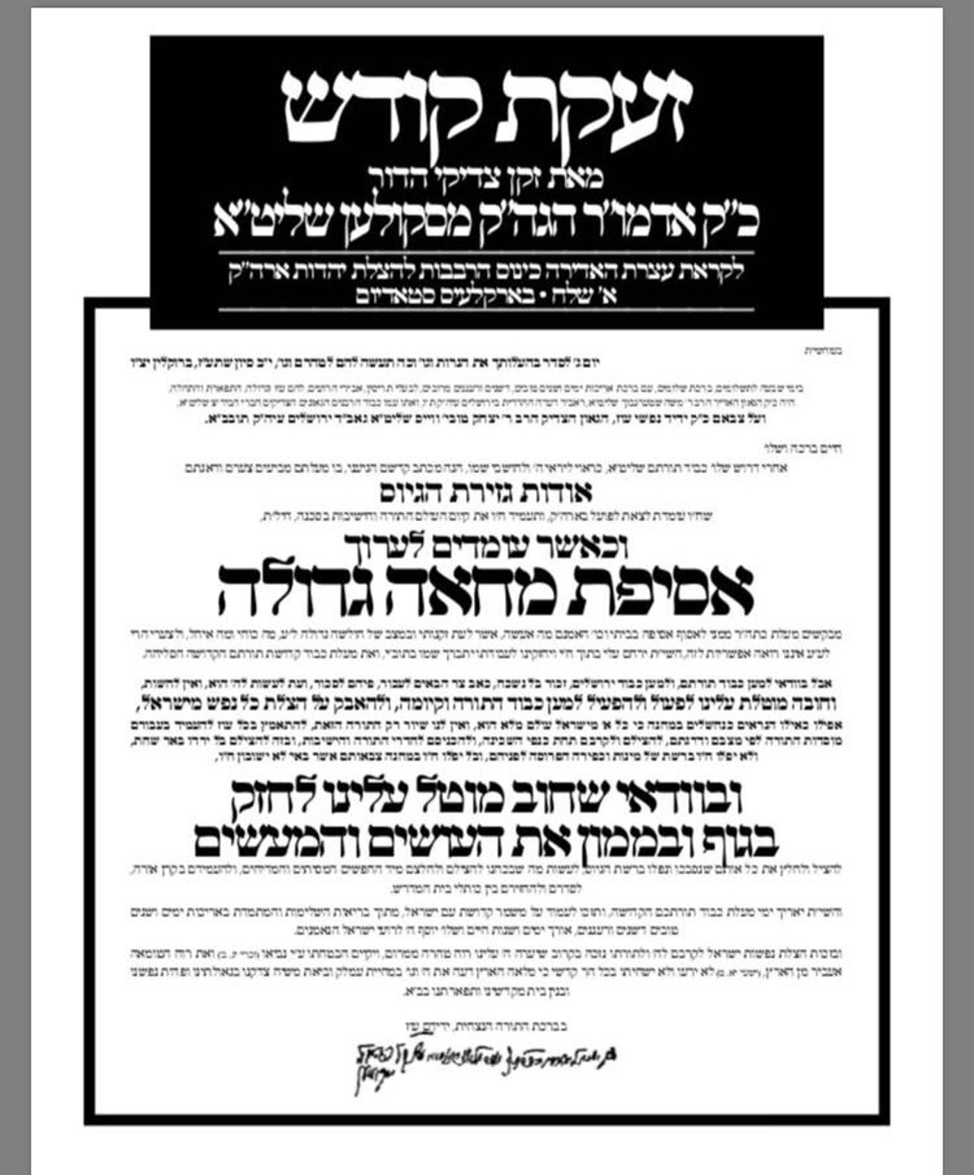 הבוקר (חמישי) פורסם מכתב מיוחד מזקן האדמו"רים בארצות הברית האדמו"ר מסקולען במענה לגאב״ד העדה החרדית הגר"ט וויס בו מתנצל על כך שלא יכול היה לקיים כינוס רבנים בביתו, מחזק את דרכי המחאה אך אינו קורא מפורשת להשתתף בעצרת.