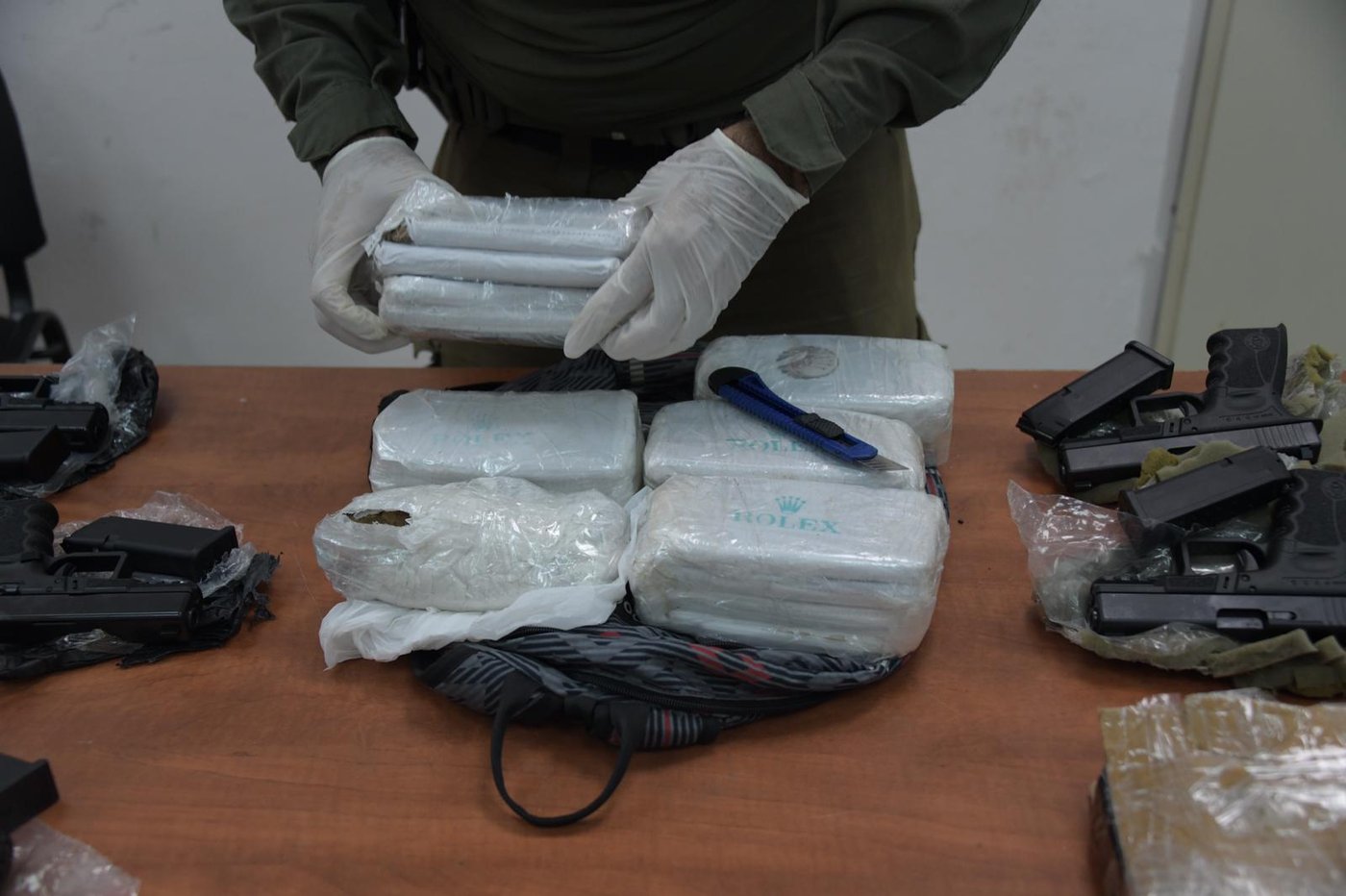 כוח של יחידת הגבולות, הוקפץ למקום ועצרו חשוד אחד בסמוך לגבול המערכת כשהוא נושא עמו תיקים ובתוכם 15 אקדחים, 36 ק"ג חשיש ועשרות מחסניות - בשווי מיליוני שקלים.