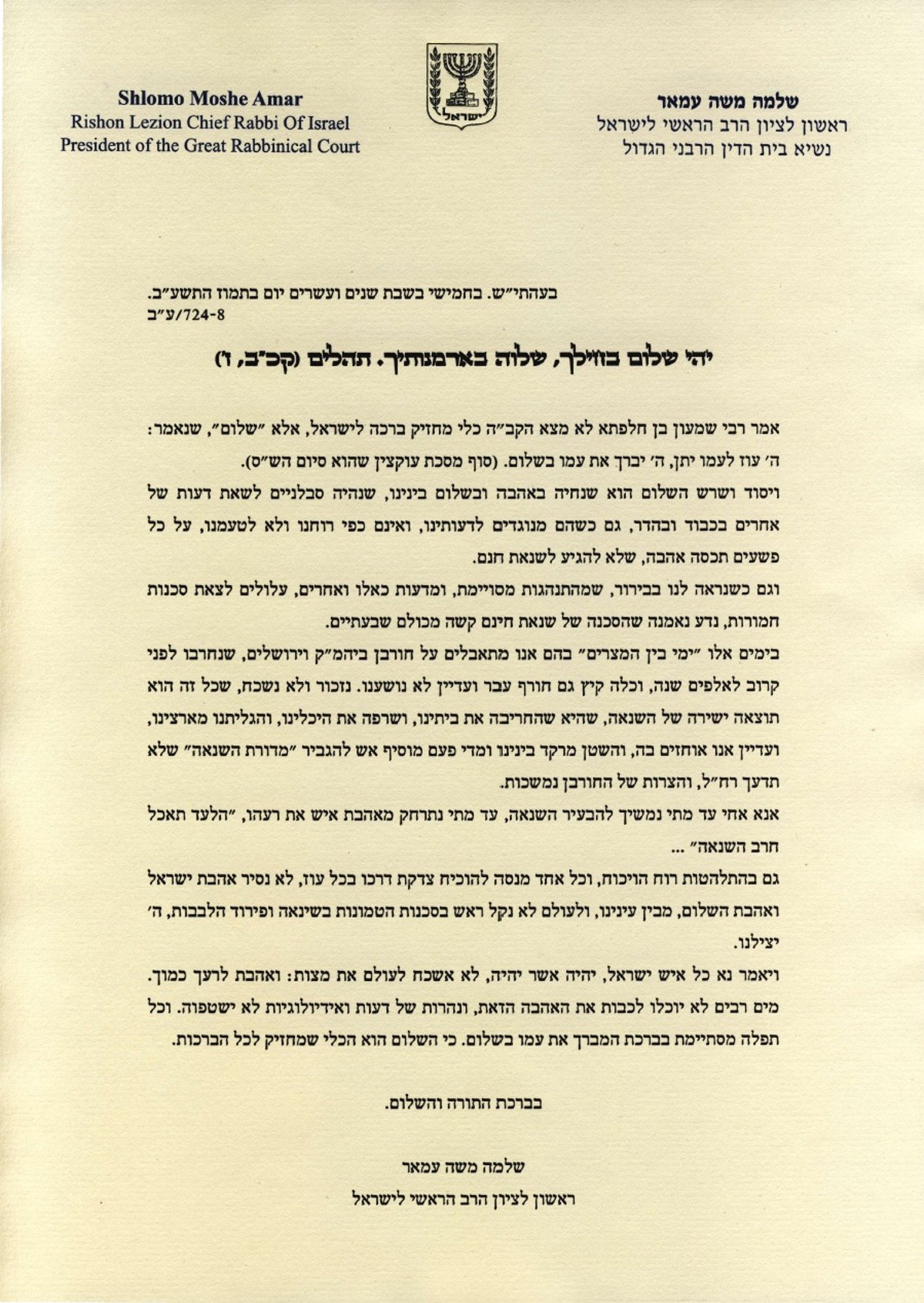 במקביל, שיגר הבוקר הרב עמאר מכתב אל מקבלי ההחלטות בו הוא קורא להרבות באהבת חינם ולא להבעיר את מדורת השנאה.