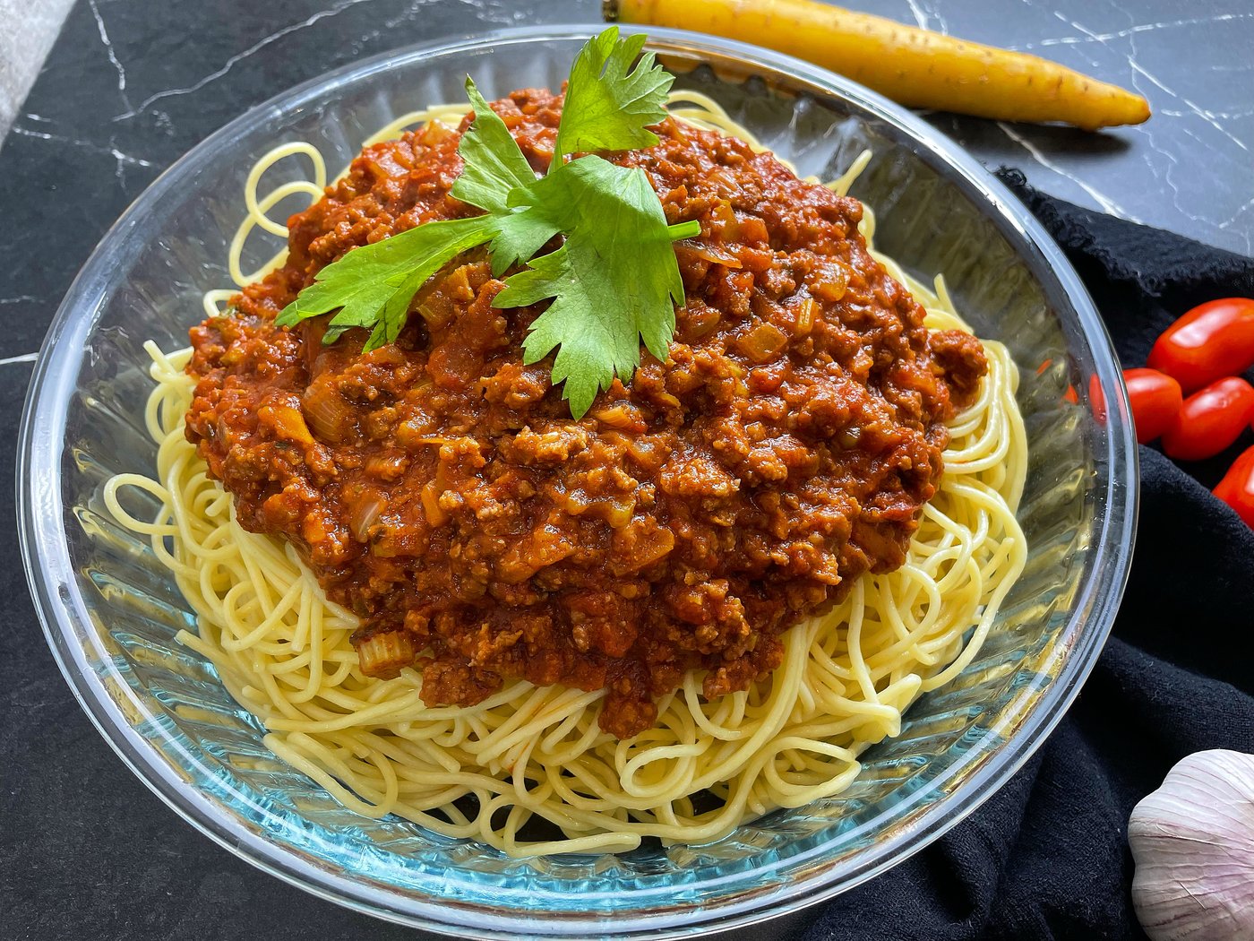 3. מוסיפים את התבלינים, הגזר, הסלרי העגבניות, הבשר ורסק העגבניות ומרסקים בעזרת מזלג את הבשר למניעת גושים. מבשלים על אש נמוכה במשך 30 דקות.