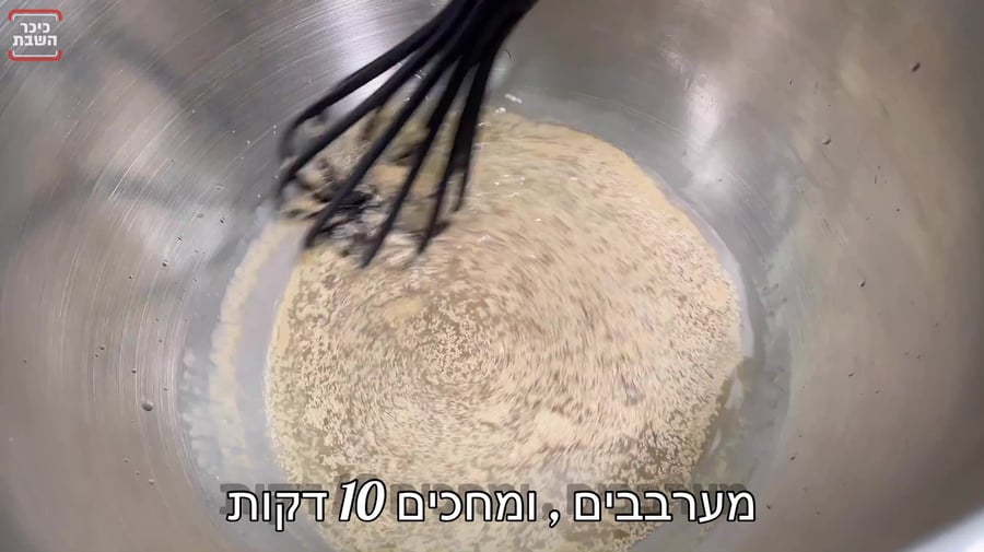 1. בקערת מיקסר, מערבבים קלות את המים, הסוכר והשמרים ונותנים לתערובת לעמוד 10 דקות.