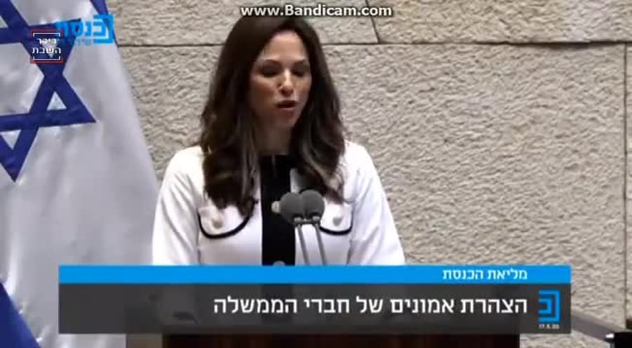 "אני, עומר ינקלביץ, בת יעקב וזלדה עדי, מתחייבת בעזרת ה' כחברת הממשלה לשמור אמונים למדינת ישראל ולחוקיה ולמלא באמונה את תפקידי כחברת הממשלה ולקיים את החלטות הכנסת".
