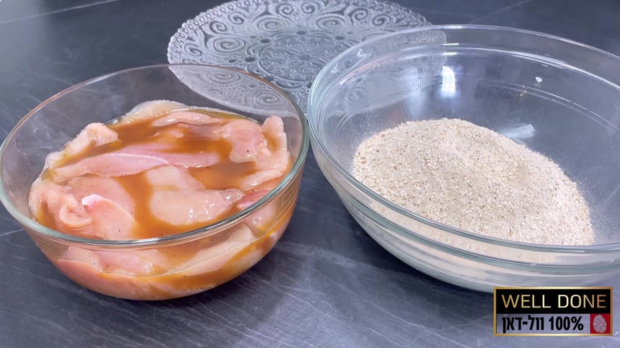 3. ביד אחת אוחזים בנתח שניצל, מניחים אותו בקערת קמח המצה, מצפים בנדיבות ועם האצבעות מהדקים את הציפוי לנתח ומשטחים קצת את הנתח. מסדרים בערימה את כל הנתחים המצופים.