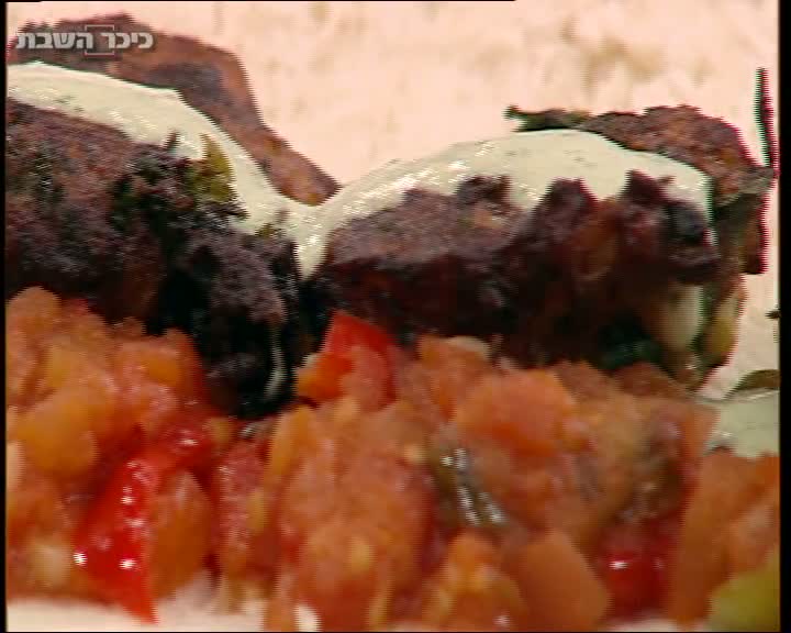 חותכים חלה טרייה לשניים, מורחים את סלט המטבוחה שהכנו, מניחים מעל את קציצות המעקוד