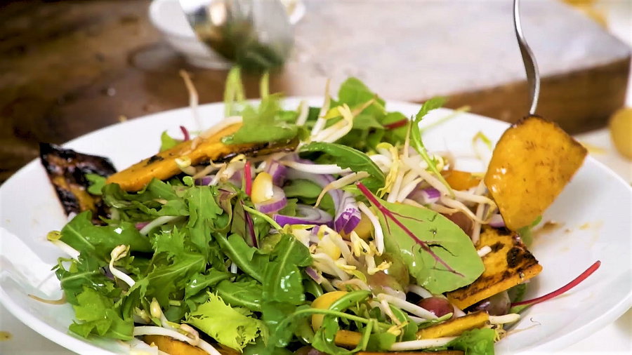 2. בקערה, מניחים את עלי הבייבי, התמרים, הנבטים והענבים ומעל הכל מסדרים את הדלעות.