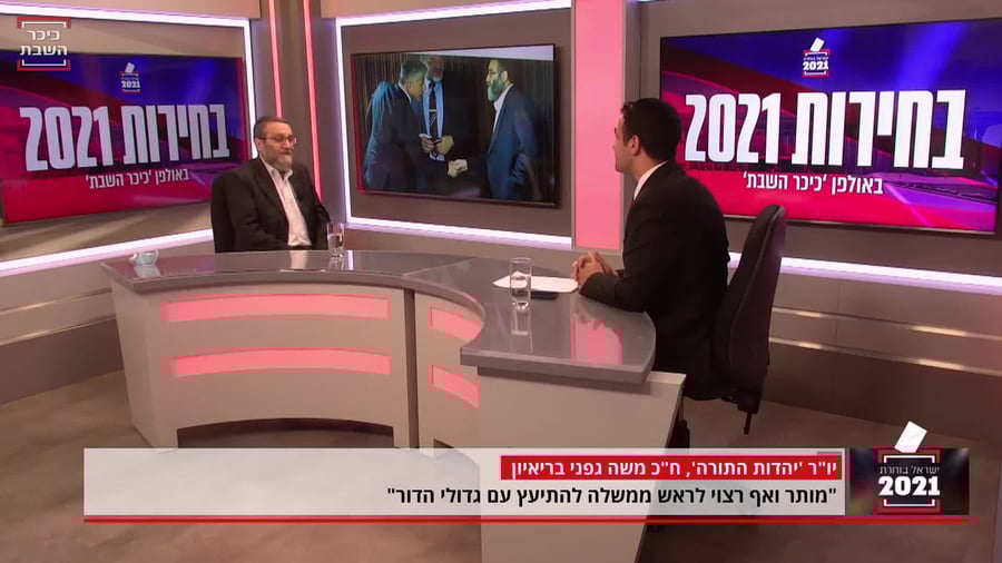 במהלך השיחה, הרים שר התורה את ידו, הניחה על ח"כ גפני, והבהיר ליו"ר 'ישראל ביתנו' כי הוא סומך על יו"ר 'דגל התורה'. "אני סומך על גפני", אמר שר התורה לליברמן, "ההבנות שהוא (גפני) יגיע אליהם, מקובלות גם עלי".