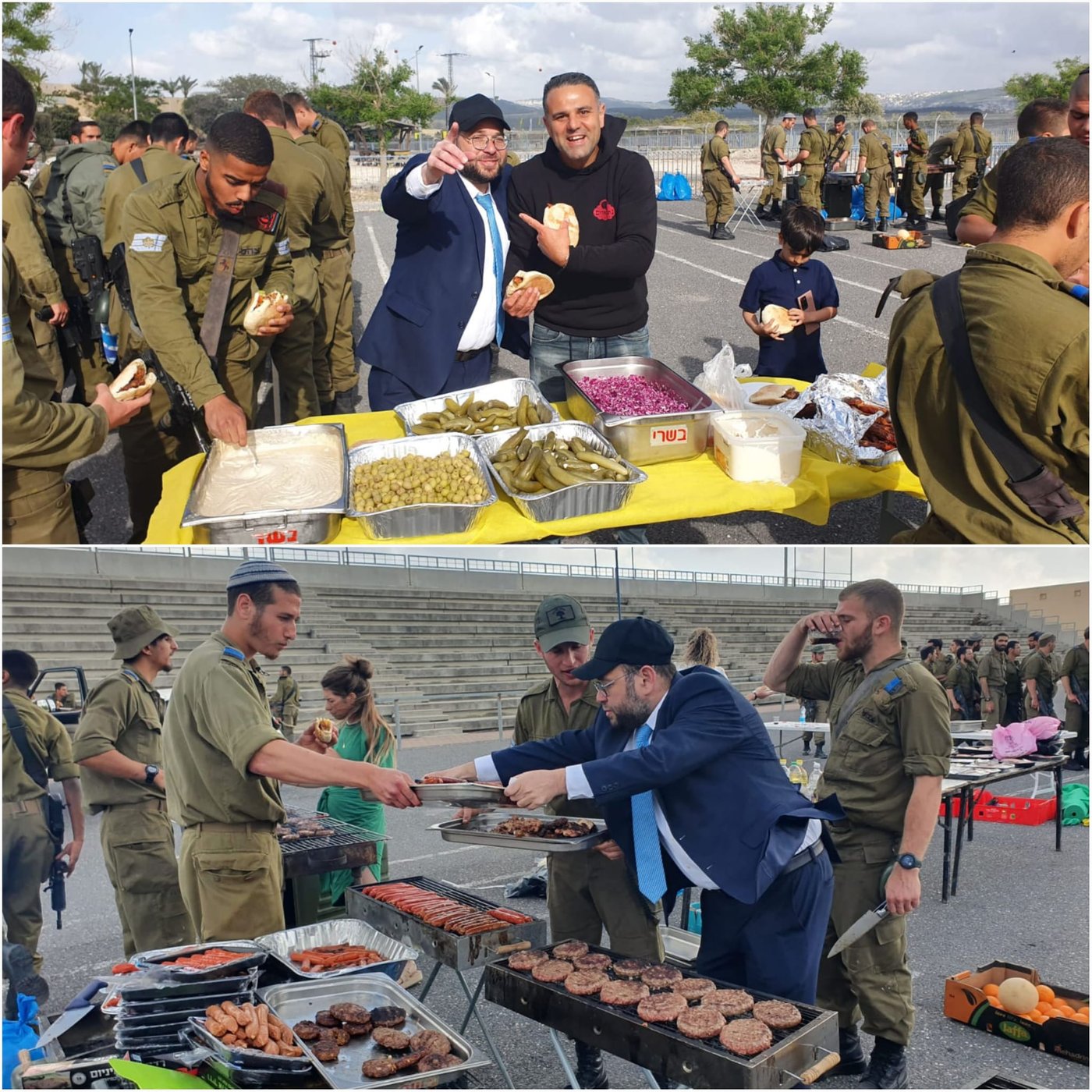 מגיש הטלוויזיה אבי כאכון והרב בן ציון נורדמן יו"ר 'דגל התורה' בחדרה, ערכו ארוחת צהריים מפנקת לעשרות חיילי גולני שפועלים בחזית להגן על עם ישראל.