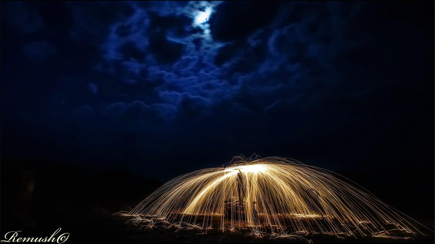 ליל ירח מלא. צפר פלדה בוער מסובב מעל ראשי כשאני עומד מעל המכונית. בחשיפה של שלושים שניות.