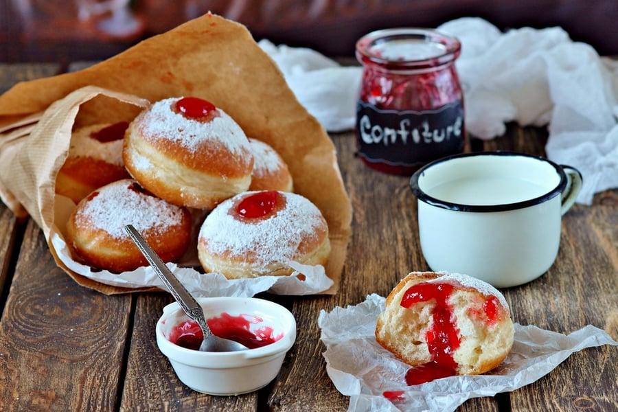 7. עם מזלף או מזרק, ממלאים את הסופגניות במילוי האהוב עליכם - או משאירים אותן ריקות! - בוזקים אבקת סוכר, ומגישים מיד, חם.