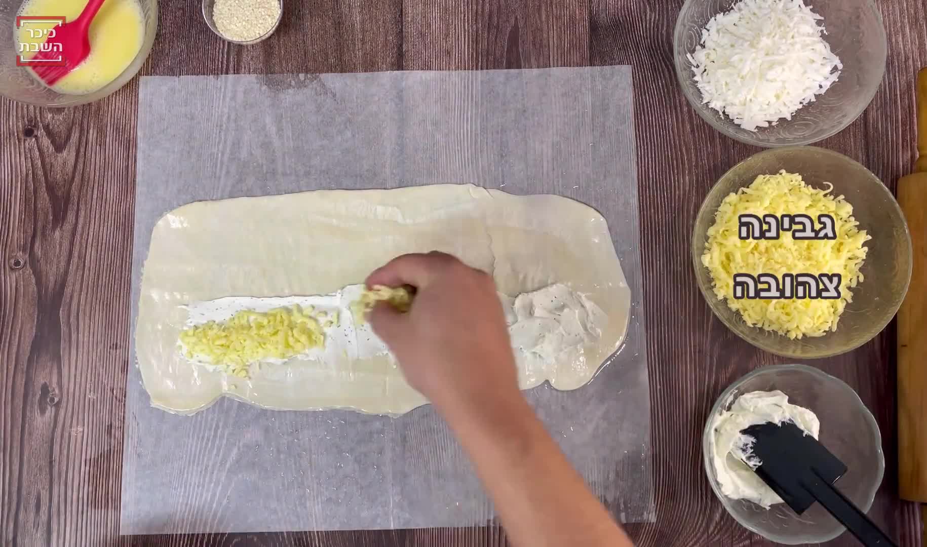 2. מורחים על מלבן הבצק מחצית מגבינת השמנת ומפזרים מעל מחצית מכמות הגבינות המגורדות, מקפלים את שולי הבצק מצד ימין ומצד שמאל ואז אוחזים את נייר האפייה מהצד שקרוב אלינו ומגלגלים לרול. מסדרים אותו לצורת חצי ירח, מברישים קלות עם ביצה טרופה ומפזרים שומשום.