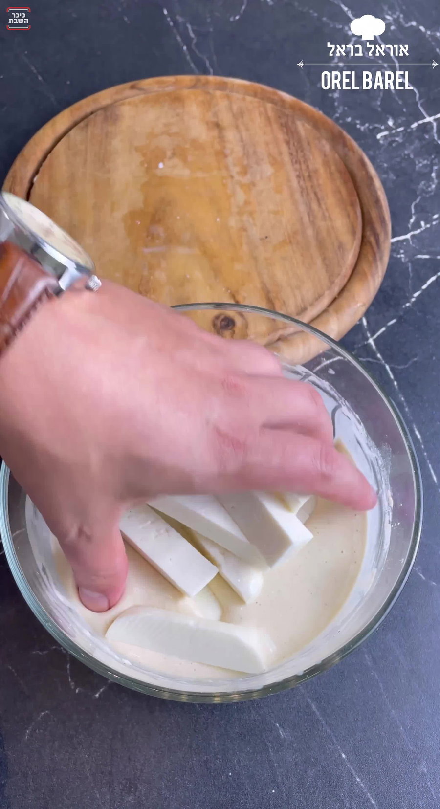 2. מוסיפים את רצועות הגבינה לבלילה ומצפים אותן מכל כיוון.