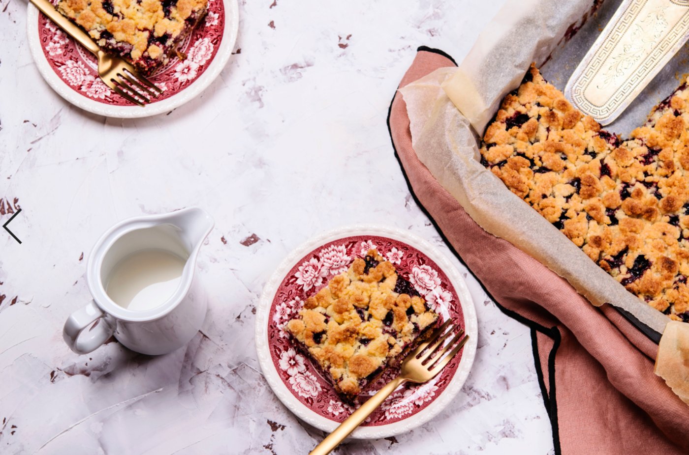4. מורחים את הריבה על פני הבסיס. מפזרים מעל את תוספת השטרויזל, משאירים חלק מהריבה גלויה ואז מפזרים את השקדים, אם משתמשים. אופים על תבנית אפיה גדולה במשך 35-40 דקות, עד לקבלת צבע חום זהוב. מניחים על רשת התנור להתקררות מוחלטת.