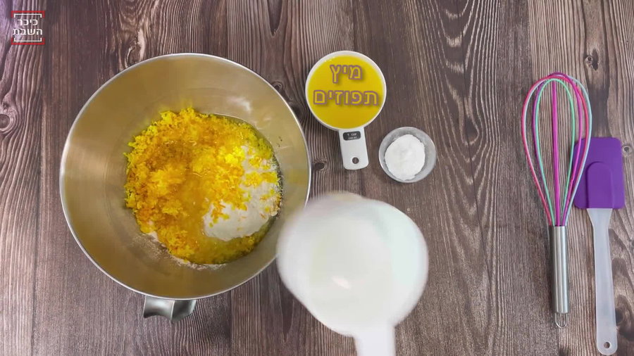 1. מניחים את החלמונים (החלק הצהוב) בקערה גדולה, מוסיפים את הקמח, אבקת האפייה, 1/4 כוס סוכר, גרידת התפוז, השמן ומיץ התפוזים ומערבבים היטב עד לקבלת בלילה אחידה.