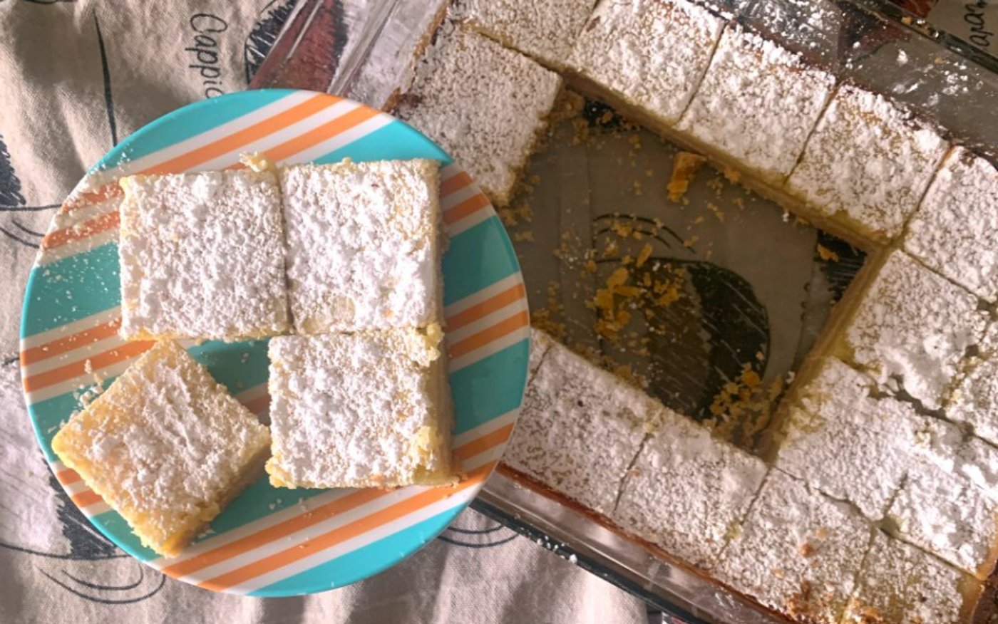 2. בקערה, מערבבים את הביצים, החלמונים, הסוכר והקמח. לאחר קבלת מרקם חלק מוסיפים את הגרידה ומיץ הלימון וממשיכים לערבב. מורידים את הטמפרטורה ל-175 מעלות. יוצקים על הבסיס האפוי למחצה ואופים עוד 35 דקות. מוציאים ומצננים בטמפרטורת החדר. חותכים לקוביות, מפדרים באבקת סוכר ומגישים.