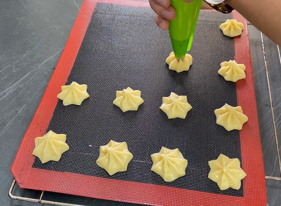 6. מעבירים את הבצק לשקית זילוף עם צנטר בצורת כוכב ומזלפים את הבצק על תבנית גדולה מרופדת בנייר אפייה. חשוב לשמור על רווחים שווים בין עיגולי הבצק.