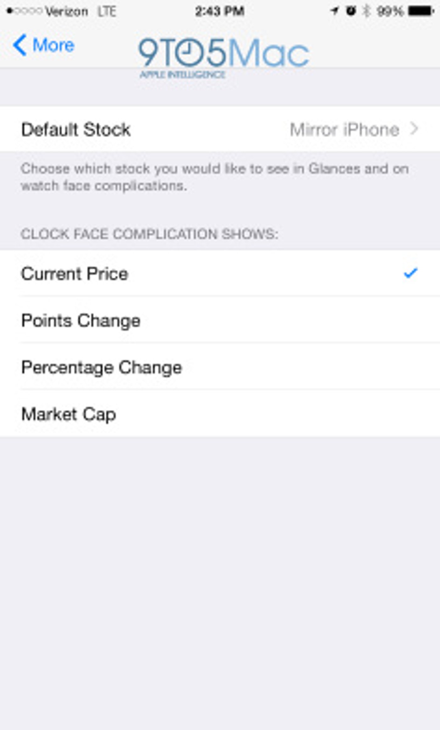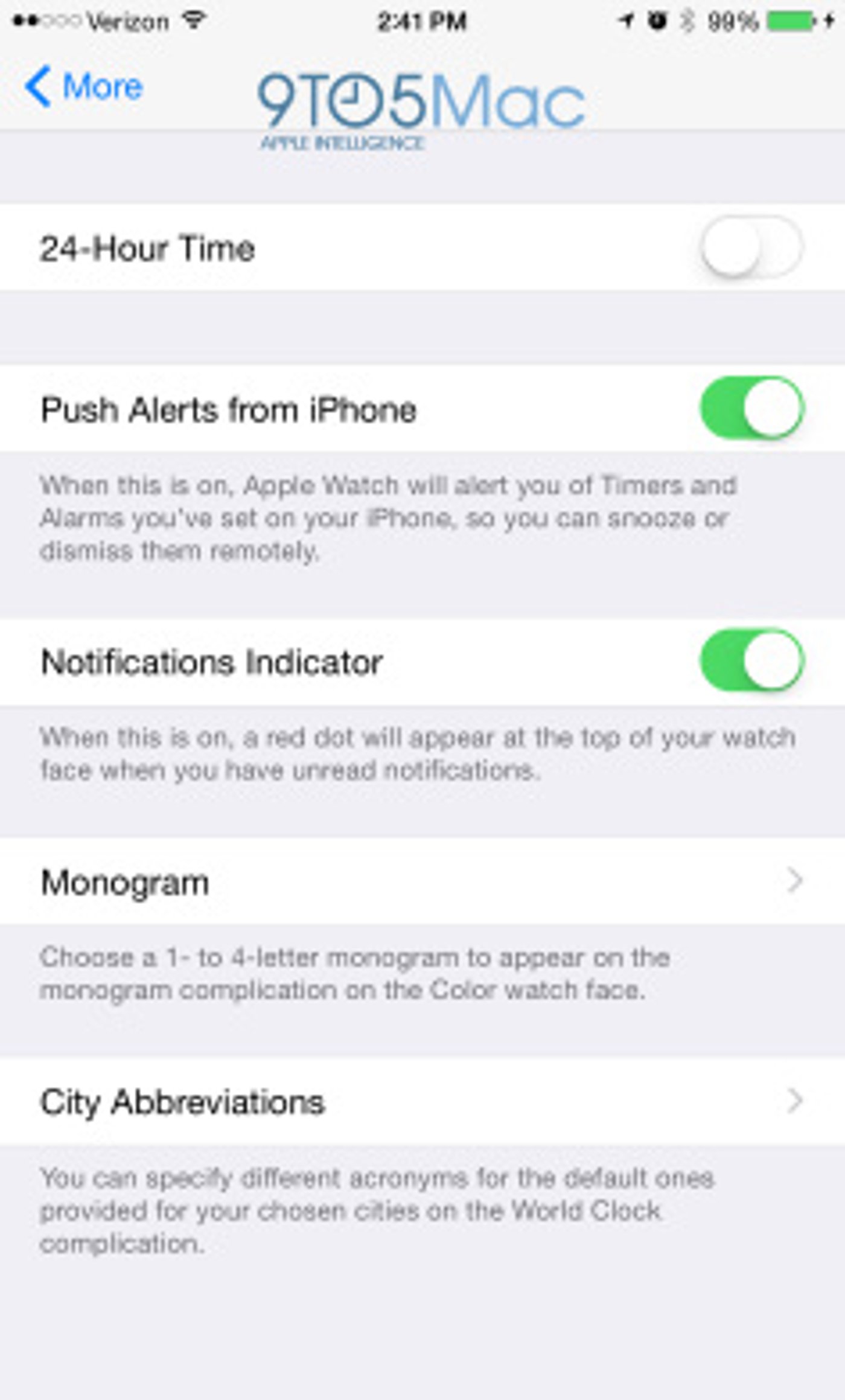 במקביל, פרסם בלוג הטכנולוגיה 9to5mac תמונות ראשונות ממה שלטענת האתר תהיה האפליקציה שתפעיל את השעון החכם של אפל. על פי התמונות, באפליקציה יוכלו המשתמשים להגדיר איזה הודעות יוצגו בשעון, אם אפשרויות לסינון לפי אנשי קשר, כמו גם שליטה באפליקציות השעון ובסדר הופעתן על מסך השעון.