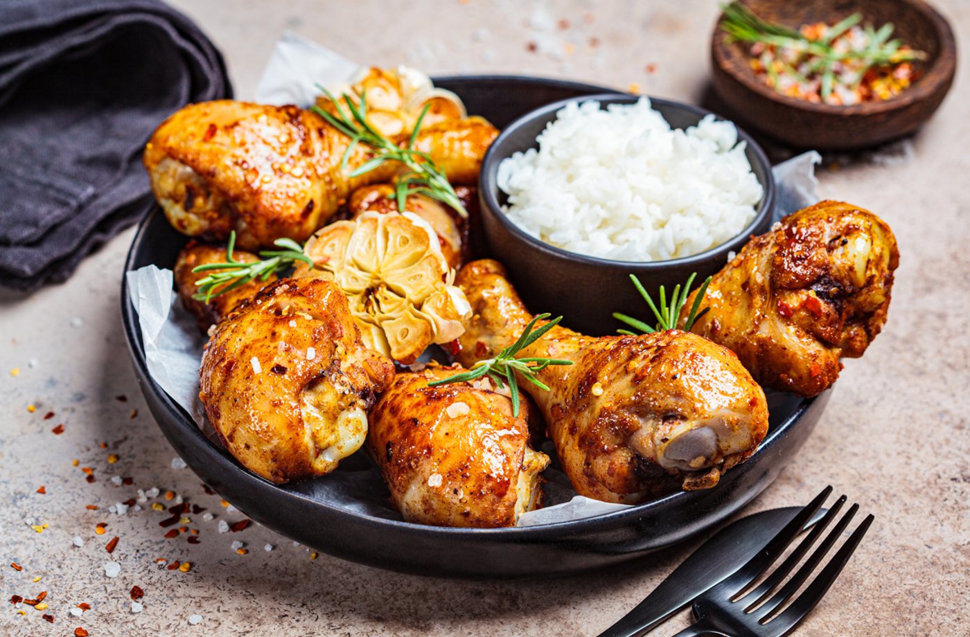 3. מייבשים היטב את שוקי העוף בנייר סופג ומניחים בתבנית. מברישים בתערובת המרגרינה. מוסיפים את היין לתבנית.