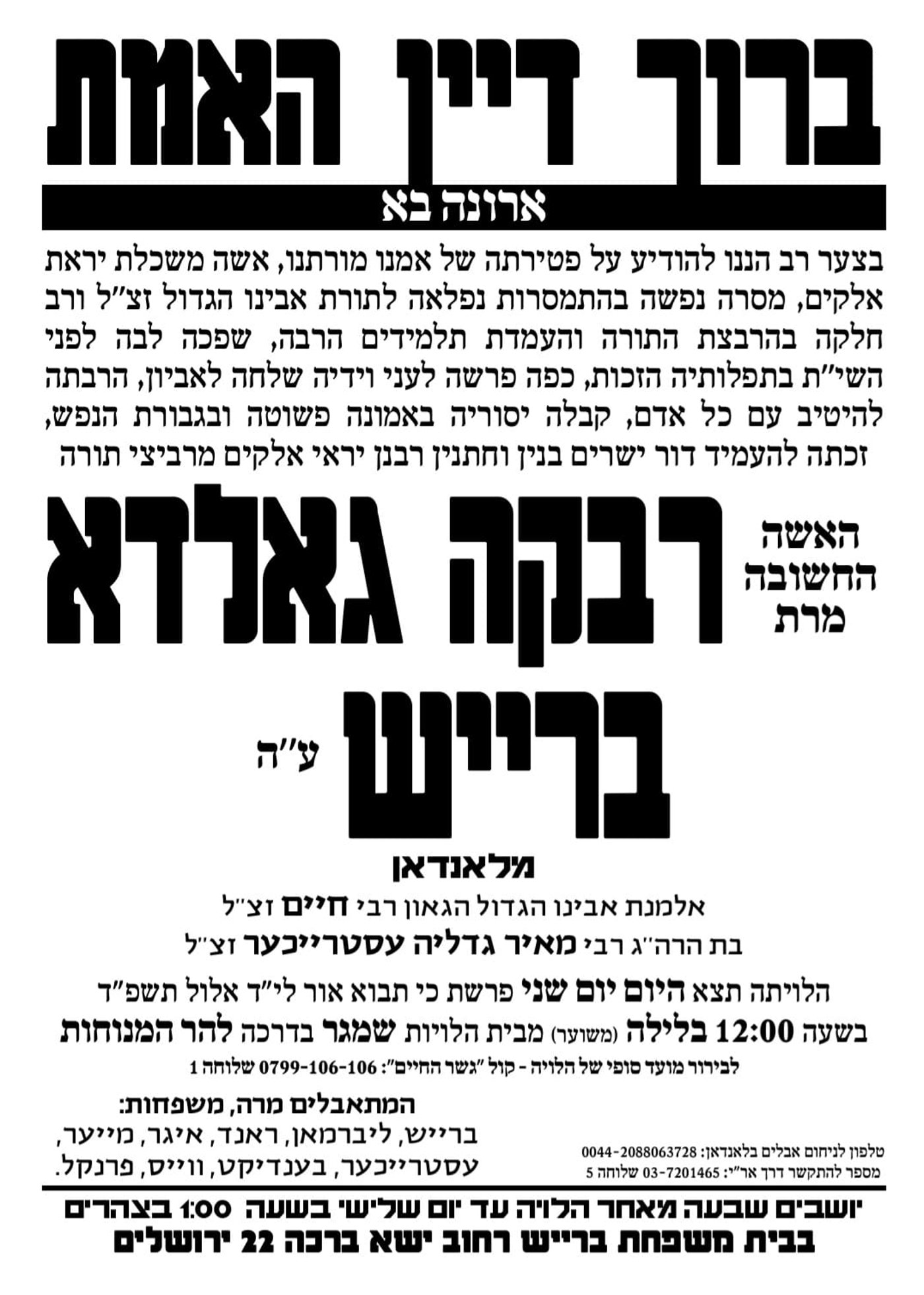 ברוך דיין האמת: מלונדון מגיעה הבשורה המעציבה על פטירתה של הרבנית הצדקנית מרת רבקה גאלדא ברייש ע"ה, אלמנת הגאון רבי חיים ברייש זצ"ל ראש ישיבת 'מתיבתא' בלונדון ובעל ה'חלקת חיים', שנפטרה בגיל 75 לאחר מחלה קשה.