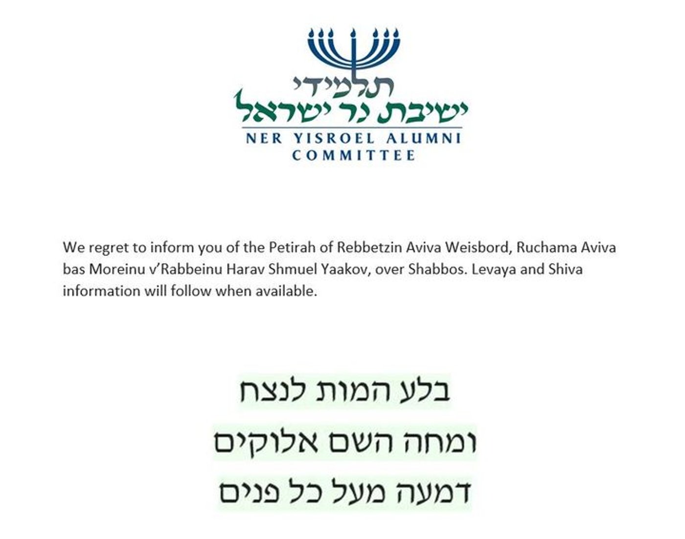 בליל שבת נפטרה בבולטימור שבמרילנד, ארה"ב, הרבנית ד"ר אביבה וייסבורד, רעייתו של משגיח ישיבת 'נר ישראל', והיא בת 72.