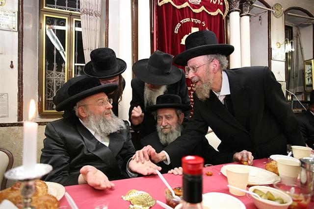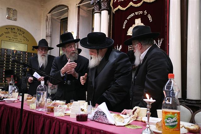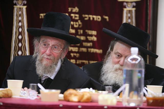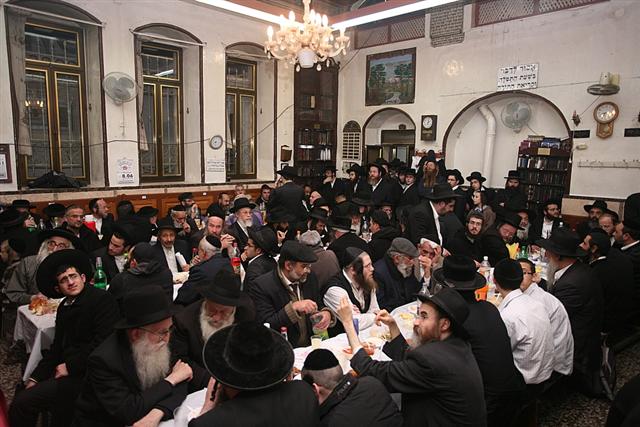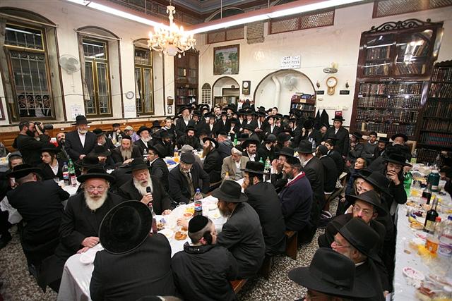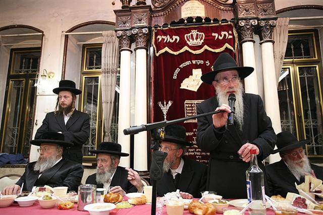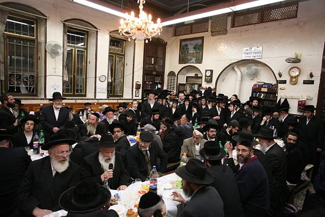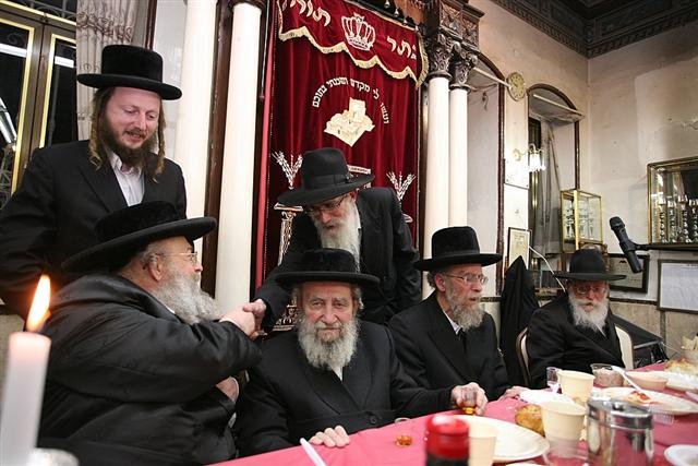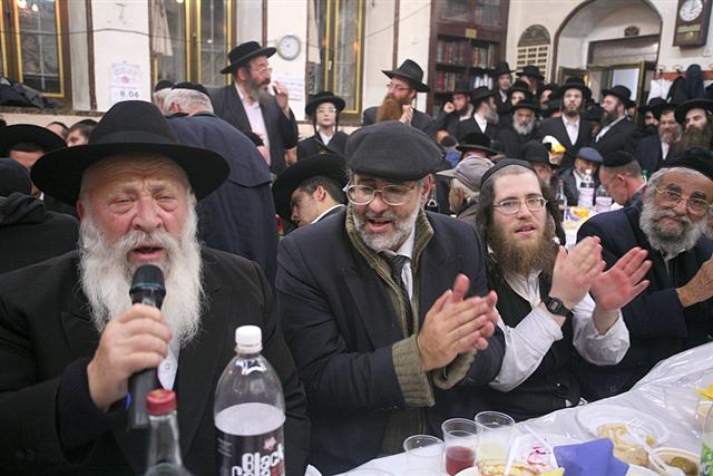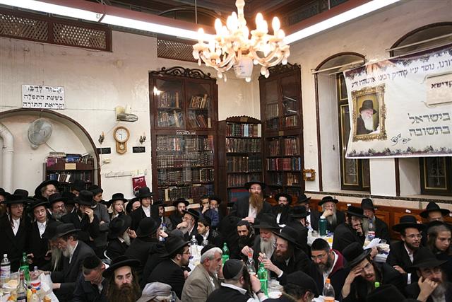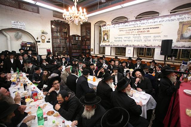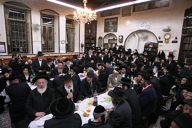 התוועדות י"ט כסלו ייחודית ומרגשת נערכה אמש בבית הכנסת חב"ד במאה שערים ירושלים. ● בהתוועדות הפתיעו בהשתתפותם שני אדמו"רים: כ"ק האדמו"ר מתולדות אברהם יצחק שליט"א שדיבר בעניין מעלת החסידות וכ"ק האדמו"ר מפינסק קרלין שליט"א שדיבר במעלת י"ט כסלו. צילום מאיר אלפסי