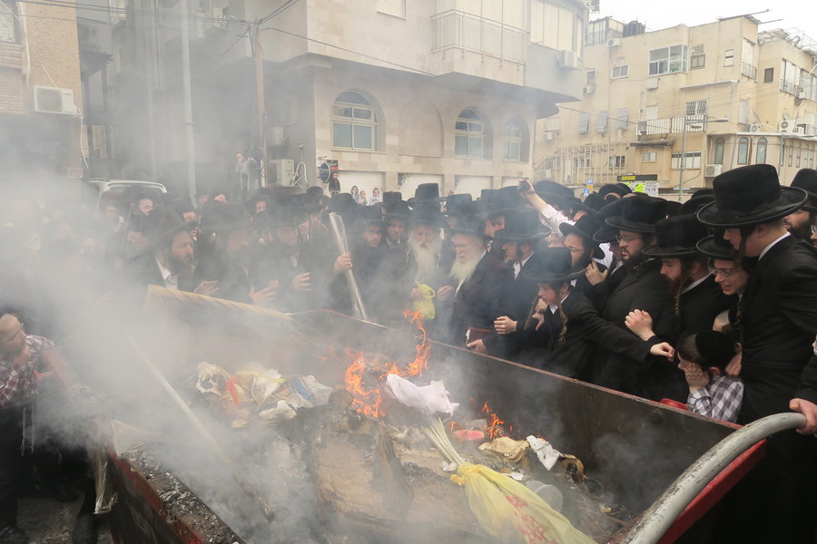 על יד כבשן האש | החסידים נדחקו סביב האדמו"ר מכנובקא בעלזא בשריפת החמץ