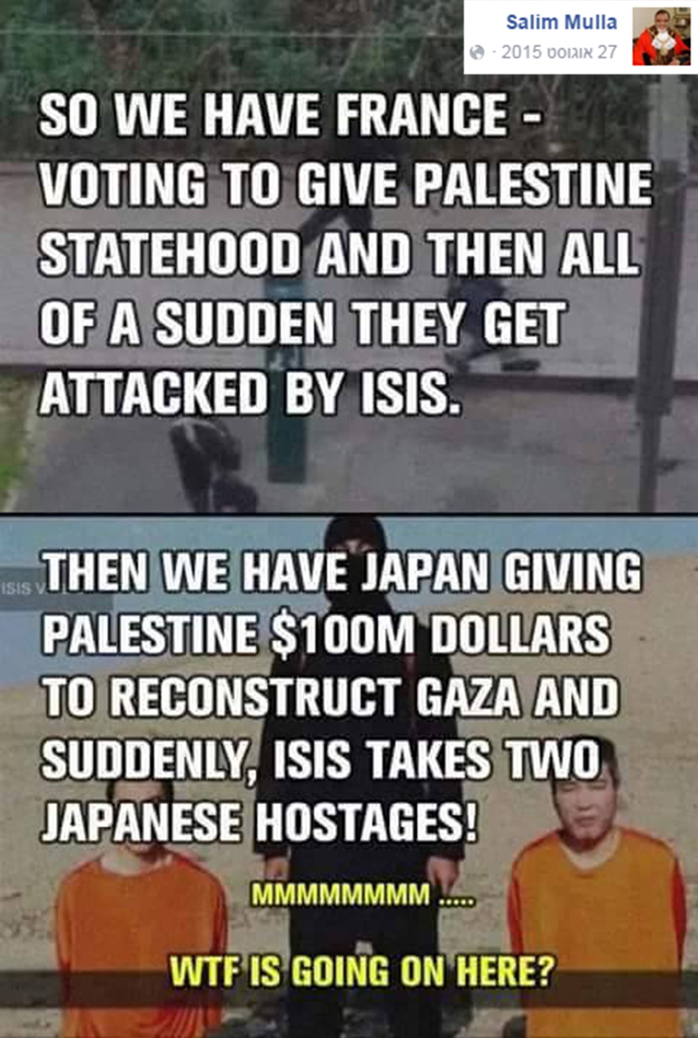 לפי הדיווח בסוכנות הידיעה AP, מולה כתב בחודש אוגוסט בפייסבוק: "האם זה צירוף מקרים? ברור שכן. כולנו יודעים איך משוחק המשחק הציוני. ברור מי מבצע בזה מניפולציה. אלה שאינם בטוחים. ישראל".