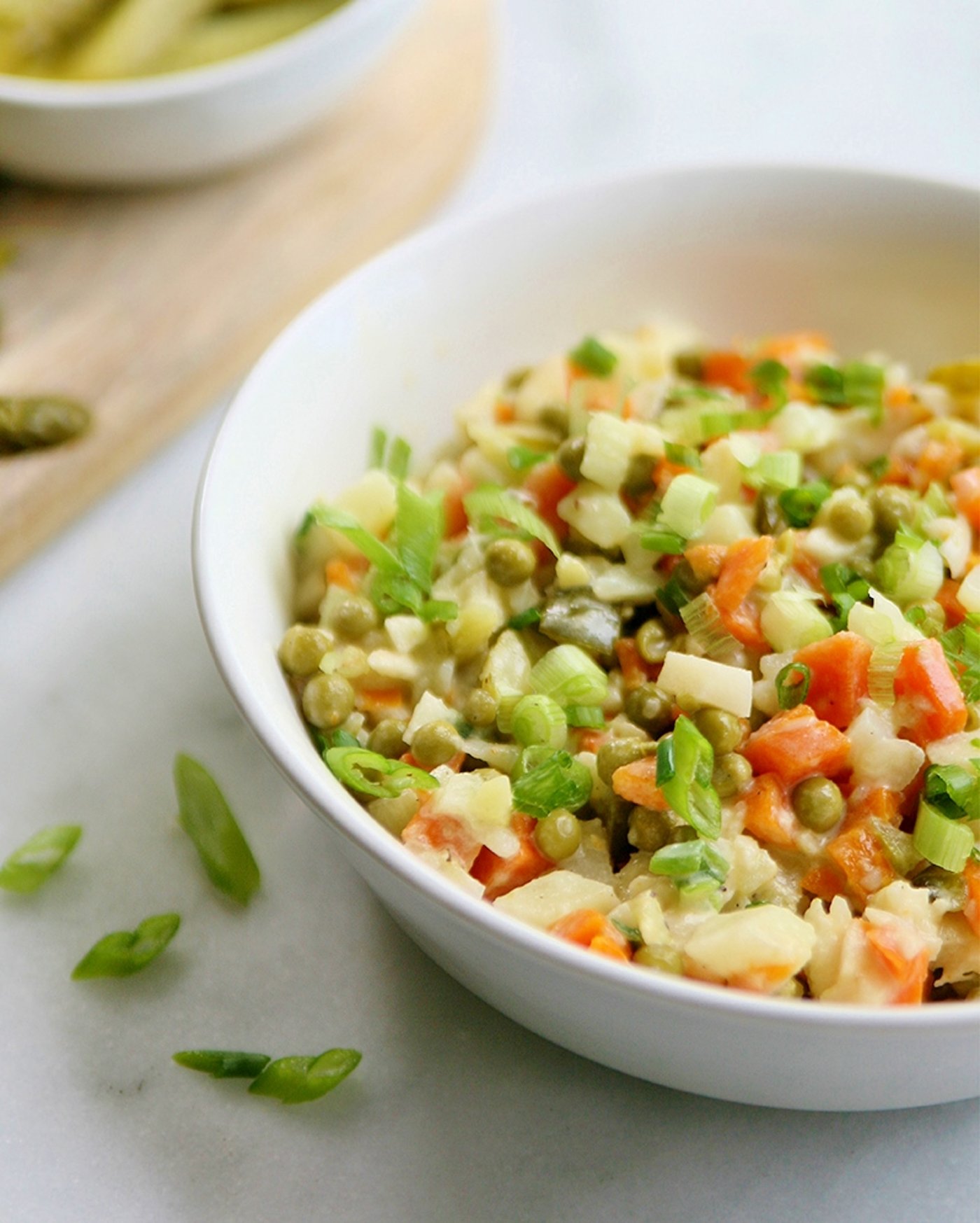 אופן ההכנה: בקערה, מערבבים יחד את תפוחי האדמה, המלפפונים החמוצים, האפונה והגזר, הבצל והמיונז, ומתבלים במיץ לימון, מלח ופלפל שחור לפי הטעם. מגישים קר.