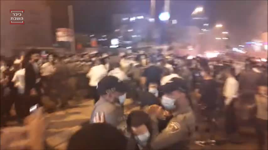 המפגינים מוחים, זה הלילה השלישי, באותה נקודה שמחו ב-2 הלילות האחרונים, היכן שאותו שוטר הכה את החרדי ששאל אותו מדוע הוא לא עוטה מסכה.