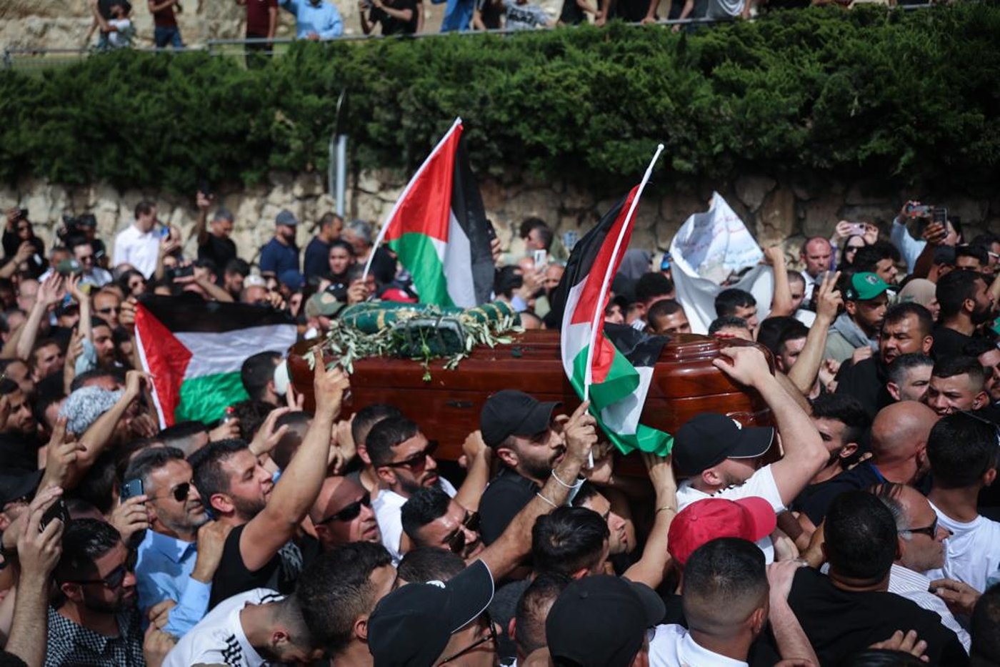 גופתה של העיתונאית יצאה מבית החולים הצרפתי בשייח ג'ראח, שם פרצו מהומות ועימותים בין המלווים לשוטרים, שאבטחו את ארון הקבורה, בדרכו לבית הקברות הנוצרי הסמוך לשער יפו.