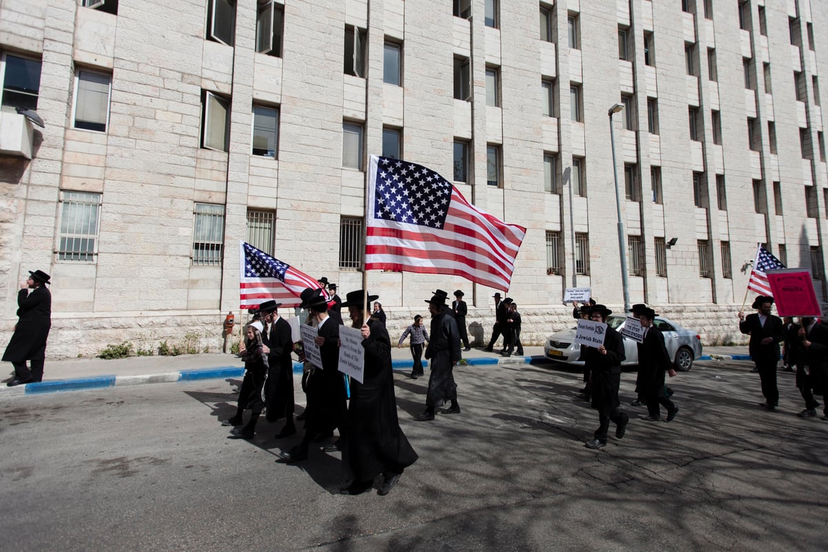 בשעות הצהריים, יצאו עשרות מאנשי 'נטורי קרתא' בתהלוכה בשכונה החרדית, כשהם מחזיקים בידיהם דגלי ארה"ב ושלטים עליהם נכתב: "תבדיל בין הציונות לבין היהדות".