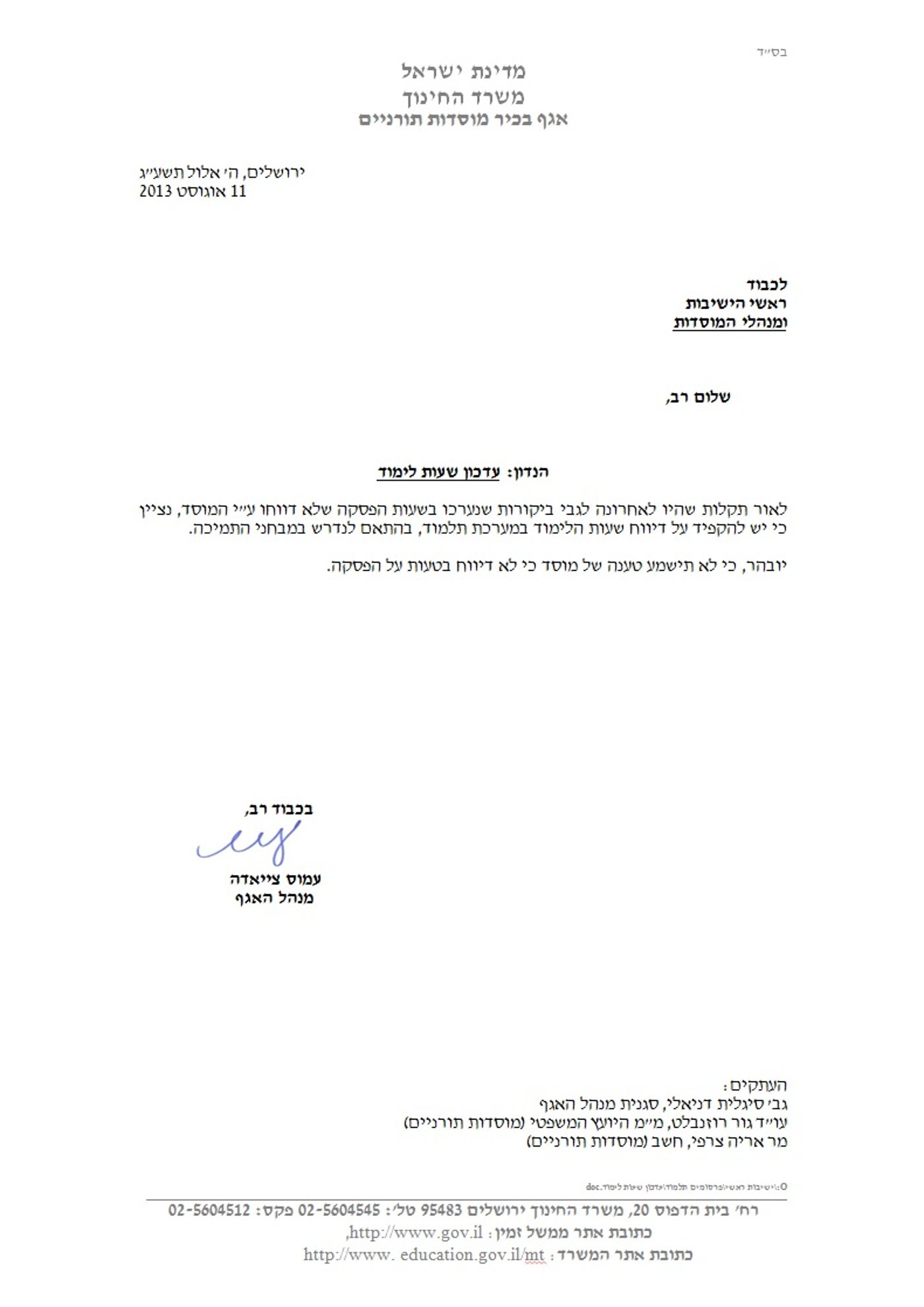 במכתב ששיגר עמוס צייאדה, מנהל אגף בכיר מוסדות תורניים במשרד החינוך, האחראי על הישיבות הקדושות, הוא מבקש מראשי הישיבות ומנהלי המוסדות להקפיד על דיווח שעות הלימוד כדי למנוע עגמת נפש מול פקחי משרד האוצר.