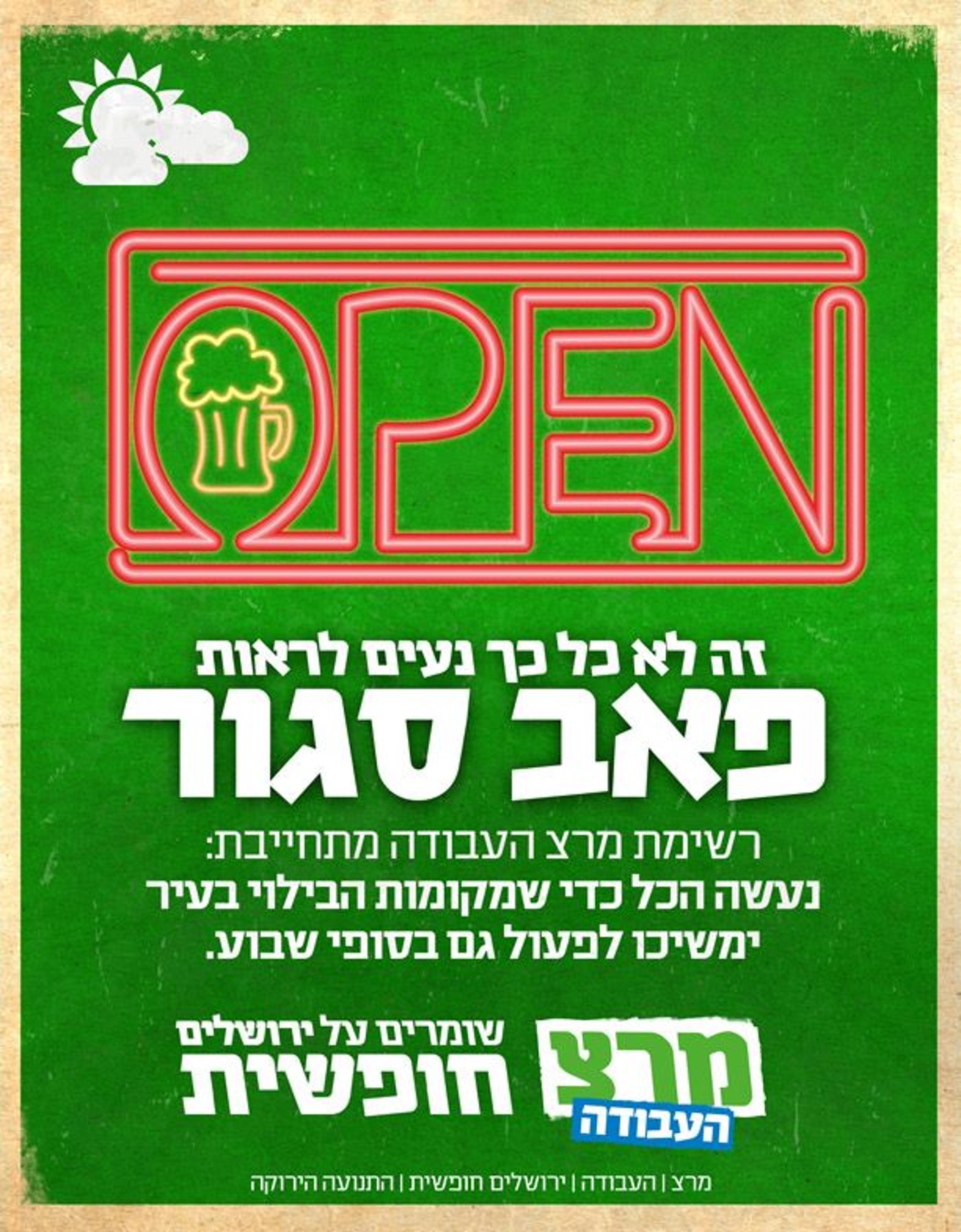במרכז העימות בירושלים, כך מסתבר, יעמוד נושא פתיחת מקומות הבילוי בסופי השבוע. ברשימה המאוחדת של מרצ והעבודה, כבר מתחייבים היום (ראשון) כי יפעלו לאחר הבחירות למען פתיחת מקומות הבילוי ביום שבת.