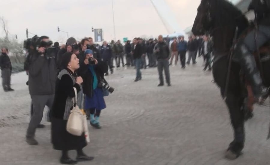 קציני המשטרה שפיקדו על הפגנת המחאה נגד גיוס תלמידי הישיבות בכניסה לירושלים, נאלצו להשתמש בסוסים בכדי לפזר את ההפגנה, אחד הפרשים עלה שלא במכוון על מפגין שעמד ברחבת ההפגנה, אישה חרדית שעברה בסמוך, זעקה לעבר השוטר: "מדוע משתמשים בסוסים, אולי תביאו טילים מעזה?", צפו בוידאו (חרדים, מעניין)