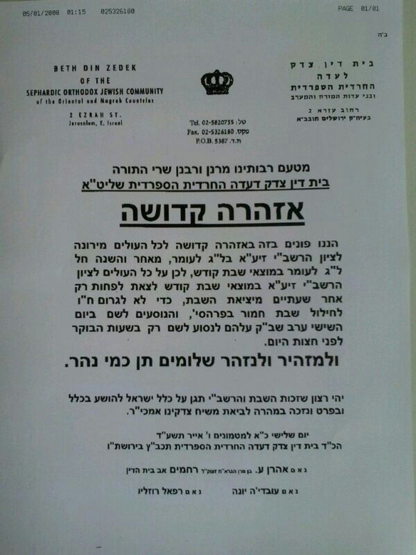ל"ג בעומר: העדה החרדית הספרדית במכתב אזהרה שלא לצאת אל הר מירון בצאת שבת ל"ג בעומר אלא שעתיים לאחר צאת השבת.