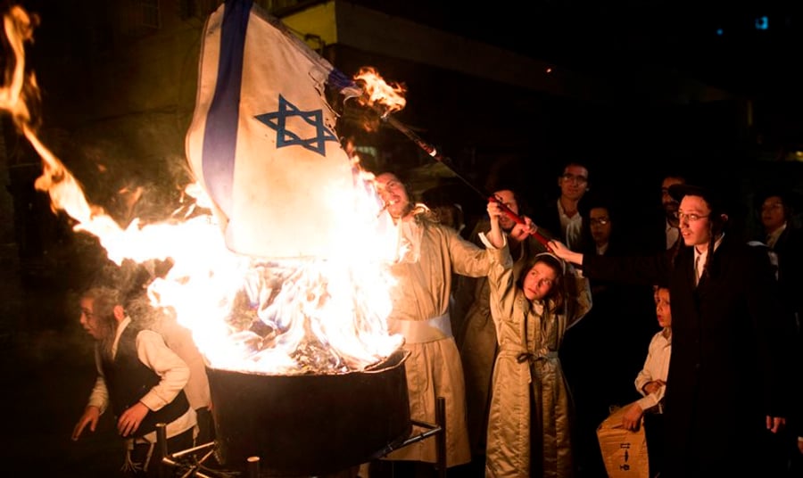 זה דוגמא של אהבהת חינם?העיקר יושבים ולומדים תורה והנה זה מה שיצא מהם בושה וחרפה לא משנה איזו מדינה יש לנו , לא שורפים דגל ישראל !!!!! חוצפנים ובזויים ! וחברים אל תתטעו לא אלה מייצגים את הזרם החרדי או את דגל התורה ,שה' ישלח להם רפואה שלימה !