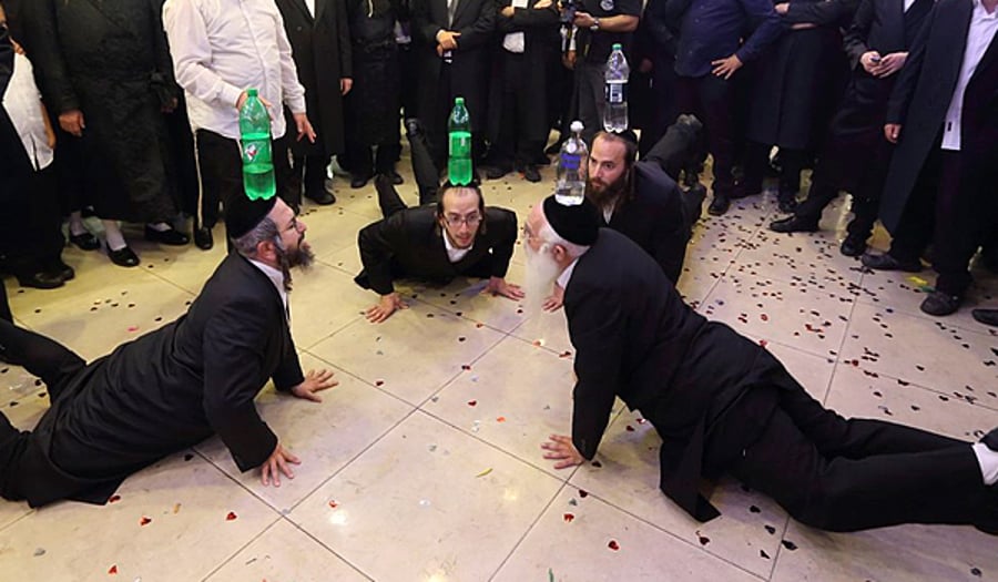 אל רחבת הריקודים נכנסים ראש המשפחה ושלושת בניו עזריאל, יצחק ונתי, ולראשיהם בקבוקים וזאת בכדי לבצע את "ריקוד הבקבוקים", האב עתיר הניסיון לוקח על עצמו את המשימה הסבוכה יותר: בקבוק וויסקי העשוי זכוכית. בניו מעדיפים לא להסתמך על הניסיון אותו צברו ומבצעים את הריקוד עם בקבוק עשוי פלסטיק. כך, במשך זמן ממושך הם מקפצים ברחבת הריקודים, לצד המוזמנים האחרים בהם הם מנסים להחדיר בהם מרץ, שמחה ואנרגיה.