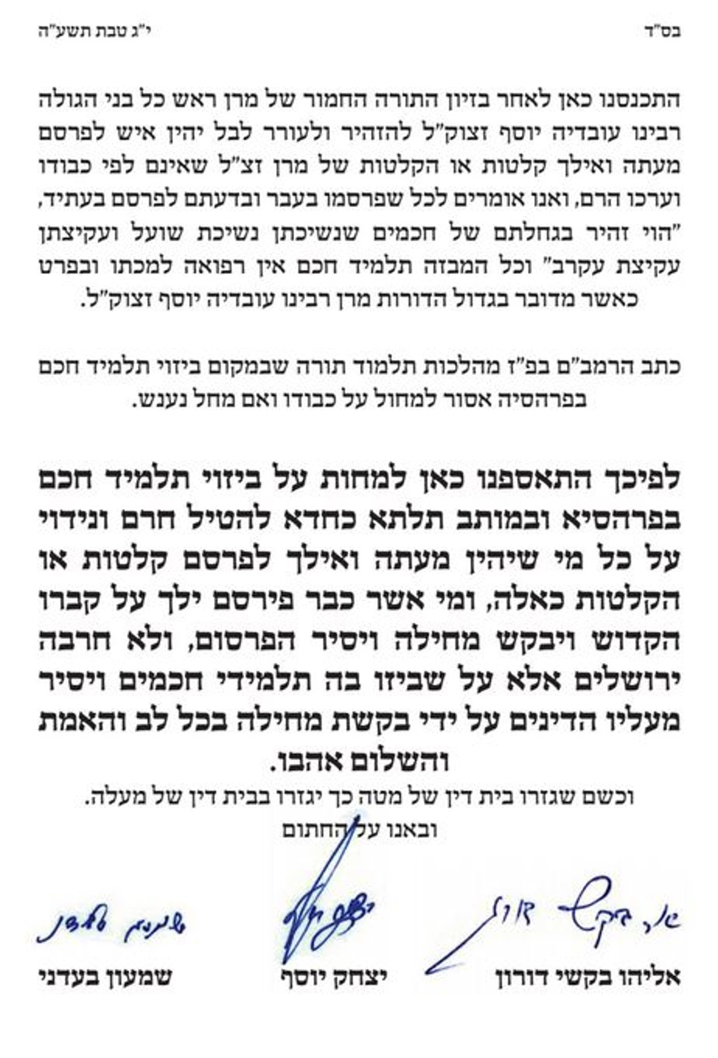 "התכנסנו כאן לאחר בזיון התורה החמור של מרן ראש כל בני הגולה רבינו עובדיה יוסף זצוק"ל להזהיר ולעורר לבל יהין איש לפרסם מעתה ואילך קלטות או הקלטות של מרן זצ"ל שאינם לפי כבודו וערכו הרם, ואנו אומרים לכל שפרסמו בעבר ובדעתם לפרסם בעתיד, "הוי זהיר בגחלתם של חכמים שנשיכתן נשיכת שועל ועקיצתן עקיצת עקרב" נאמר בהחלטת הרבנים.
