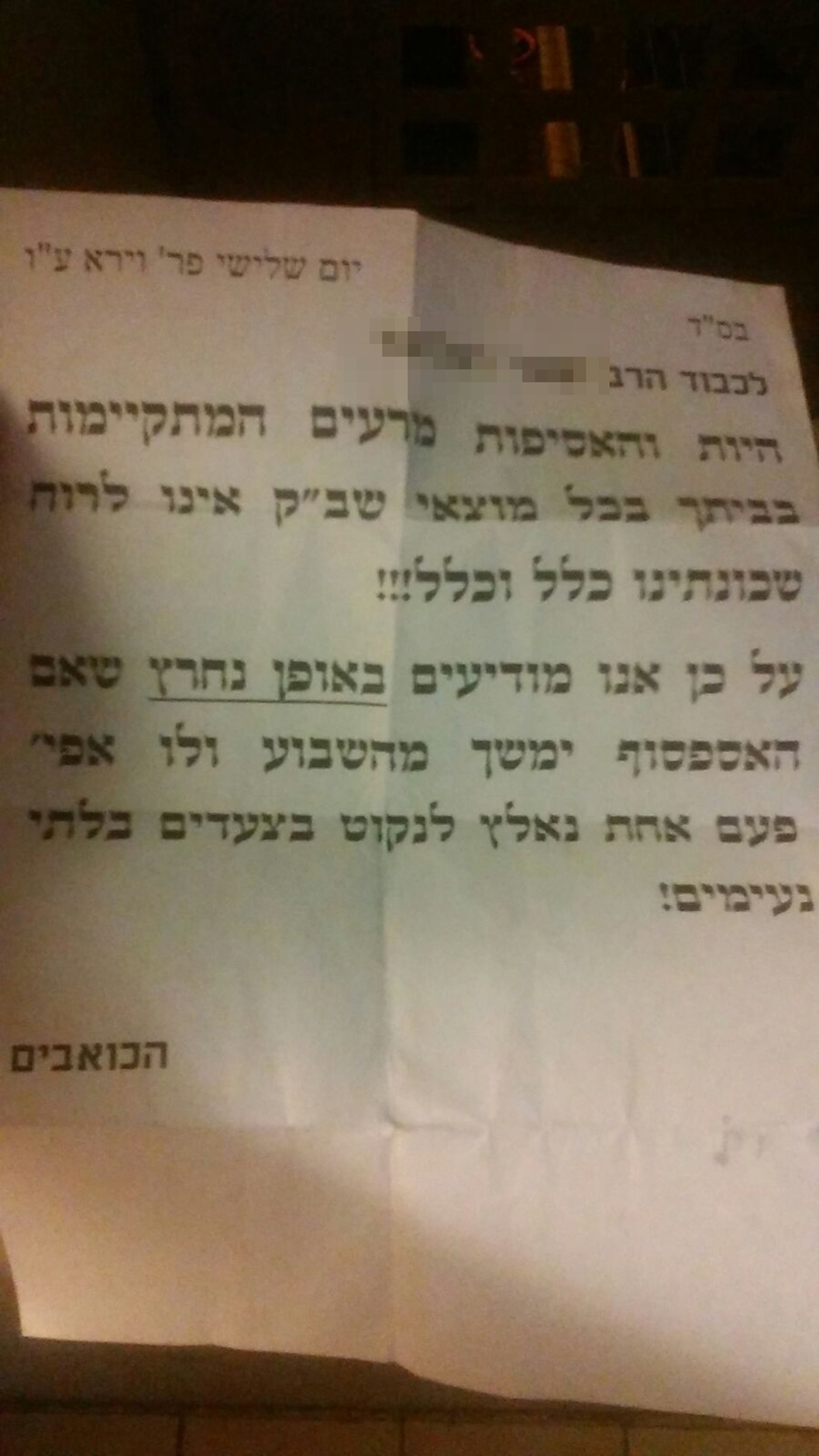 קודם ביצוע המעשה שיגרו הקיצוניים מכתב לבעל הדירה ובו כתבו: "היות והאסיפות מרעים המתקיימות בבית בכל מוצאי שבת אינו לרוח שכונתנו כלל וכלל. על כן אנו מודיעים באופן נחרץ שאם האספסוף יימשך מהשבוע ולו אפילו פעם אחת נאלץ לנקוט בצעדים בלתי נעימים!".