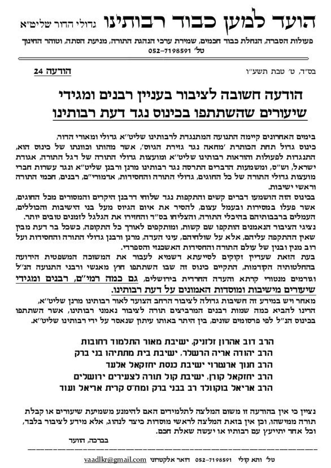 "מאחר ויש במידע זה חשיבות גדולה לציבור הרחב הצועד לאור רבותינו מרנן שליט"א, הרינו להביא כמה שמות רבנים המרביצים תורה לציבור נאמני רבותינו, אשר השתתפו בכינוס הנ"ל לפי פרסומים שונים, בין היתר באותו עיתון שנאסר ע"י גדולי רבותינו שליט"א", מדווח הוועד.