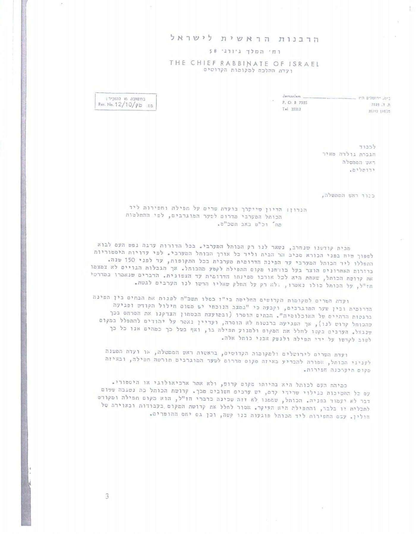 במכתב, שנשלח בעבר לראשת הממשלה גולדה מאיר מדגישים גדולי ישראל את מעמדו ההלכתי וקדושתו של החלק הדרומי של הכותל המערבי, זאת ביחס לחלקו הצפוני של הכותל - הרחבה הקיימת.