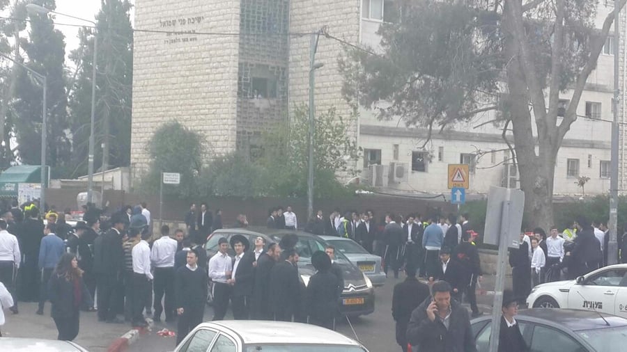 מאות בחורים מקיפים את הבניין, בשלב זה המשטרה סגרה את רחוב הפסגה במטרה להרחיק את הציבור. במקביל, שוטרים מפנים בקרטונים את ספרי הקודש ותשמישי הקדושה מהיכל בית המדרש.