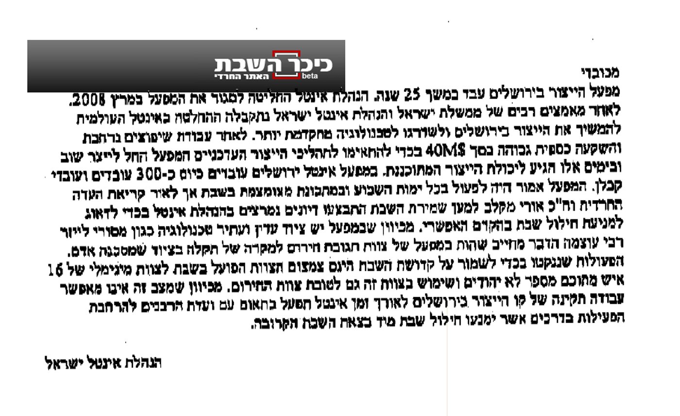 על-פי המידע שהגיע לידינו עולה, כי לפני מספר דקות העבירה חברת 'אינטל' מסמך הבנות ראשוני לוועדה למען השבת, שכותרתו, צמצום מקיף של חילולי השבת עד הפסקתם.