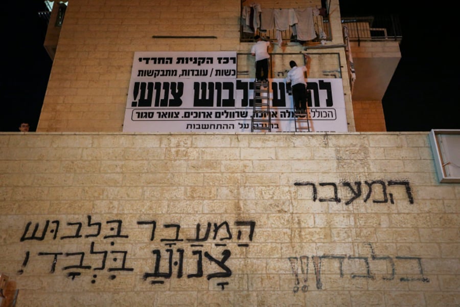 תליית שלטי צניעות בבית שמש. ארכיון (צילום: יעקב לדרמן, פלאש 90)