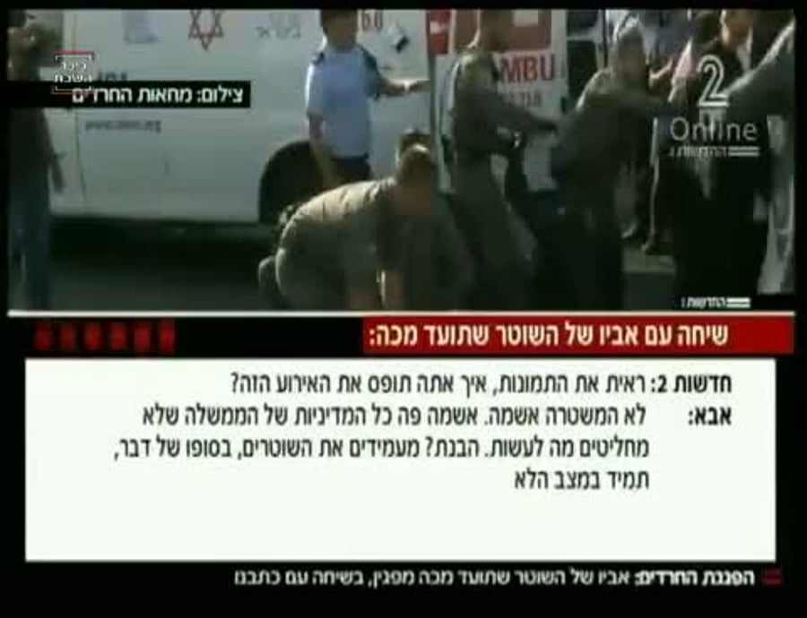 אבם גם הוא הודה: "חשתי לא בנוח לצפות בתיעוד שבו נראה בני. אמנם, אנחנו רואים רק דברים ערוכים, לא רואים את הכל. סוס שרודף אחרי חרדי זה נראה נורמלי? גם לא נורמלי. רק המדינה צריכה להחליט מה עושים. לפני חודש היו 4 שוטרים מול 300 חרדים. מה אתם רוצים שהם יעשו תגיד לי?".